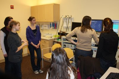 On Friday afternoon, I brought the Madison Opera High School Apprentices to the UW Voice and Swallow Clinic, a great resource for singers in the community. Our guide was Sarah Melton, a speech pathologist at the clinic, and she talked to the apprentices about healthy practices for young singers. It was also a bit of an anatomy lesson, a chance to see and learn exactly what muscles are used to produce those vibrations we sometimes call arias. The grand finale was for each of the apprentices to get “scoped,” a procedure that involves a scary looking (but harmless) camera taking live video of one’s vocal folds flapping back and forth, rendered in slow motion by, of all things, a mini strobe light. You can click the first link above to browse the Voice Clinic’s page for singers. Go here for information on “Explore the Voice,” a free, day-long seminar on vocal health sponsored by the Voice Clinic and Madison Opera on May 16. Much more on that later, but for now enjoy these pictures from Friday.