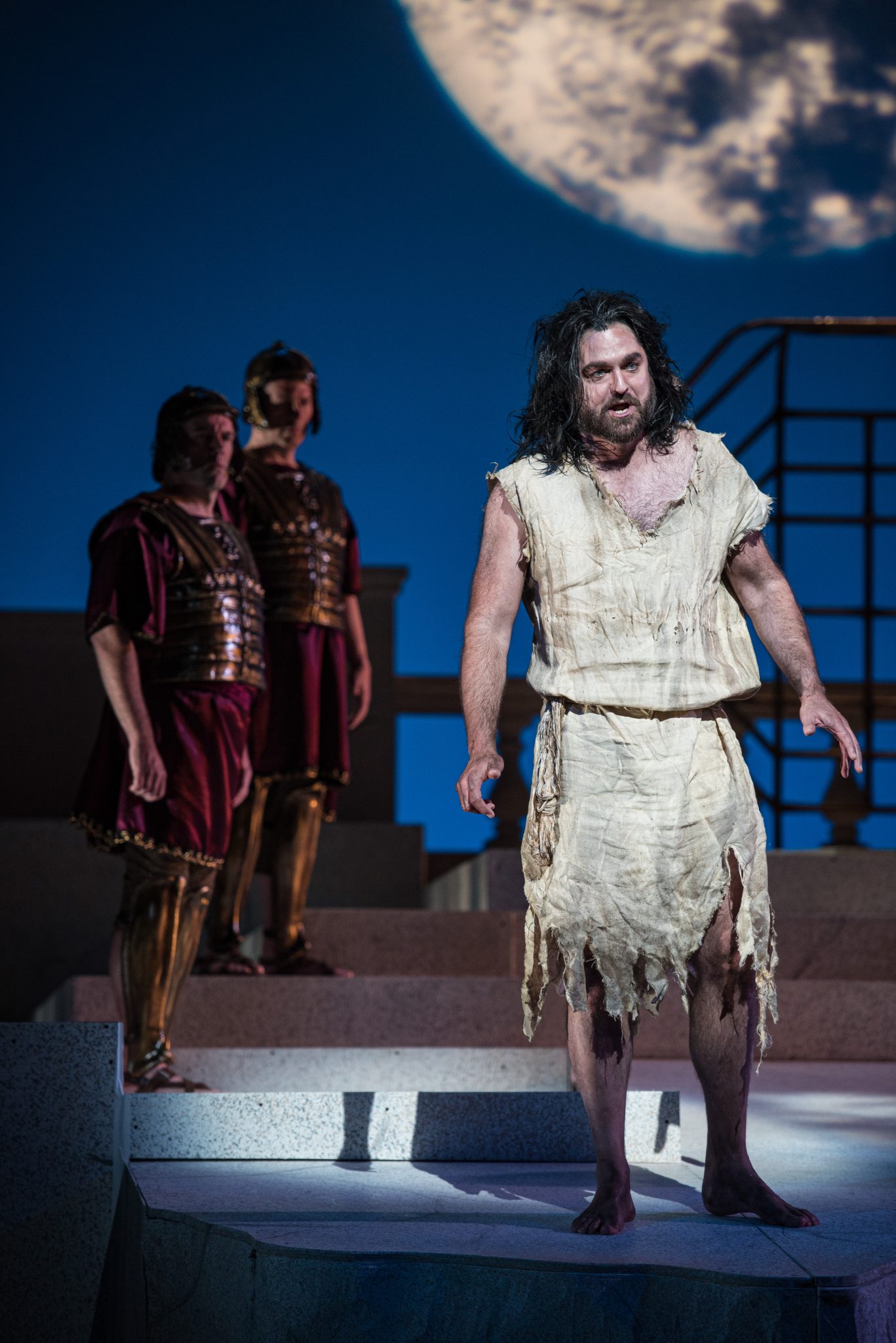 Herod appears from the palace, looking for the princess and commenting on the strange look of the moon. When he slips in Narraboth’s blood, he panics and has hallucinations. Herodias angrily dismisses his fantasies and asks him to go back inside with her, but Herod’s attentions are now focused on Salome. He offers her food and wine, but she rejects his advances.